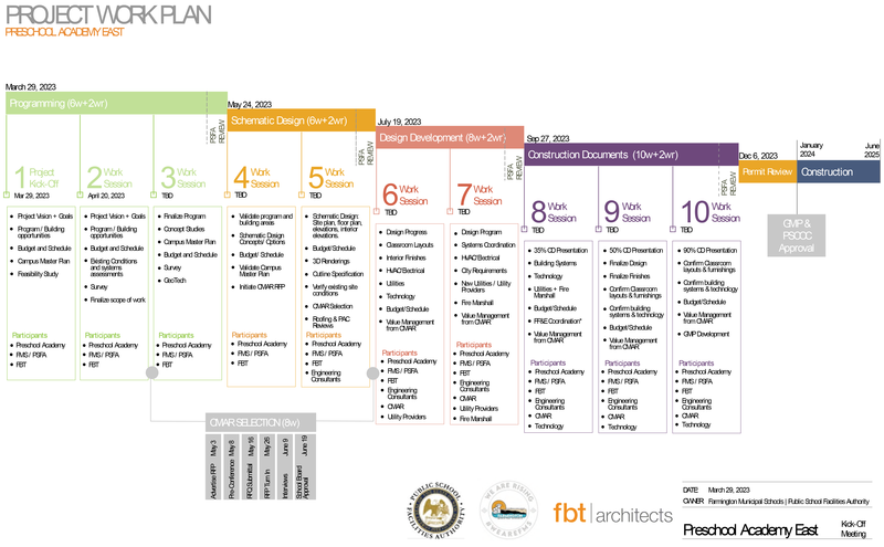 The funding request for a new Preschool Academy East by Farmington Municipal Schools (FMS) has been approved by the Public School Capital Outlay Council (PSCOC). The project is estimated to cost approximately 27 million dollars and is expected to be completed by August 2025. FMS has requested a waiver of construction costs due to being at 100% bond capacity. See the project's proposed timeline below.