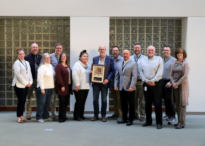 The FMS Board of Education recognized Kyle Rhodes (center), for his contribution to education during his twelve years of service to the district at last March’s regular board meeting. From left to right: Bobbi Newland (Chief Financial Officer), Chris Pash (Executive Director of Human Resources), Joan Vallee (Board Deputy Secretary), Robert Emerson (Chief of Technology), Nicole Lambson (Executive Director of Curriculum & Instruction), Stephanie Thompson (Board President), Kyle Rhodes, Keith Corley (Board Vice President), Cody Diehl (Superintendent), Nathan Pierantoni (Executive Director of Support Services), Ted Lasiewicz (Chief of Operations), Colton McClanahan (Board of Education Executive Assistant), and Andra Stradling (Board Secretary).