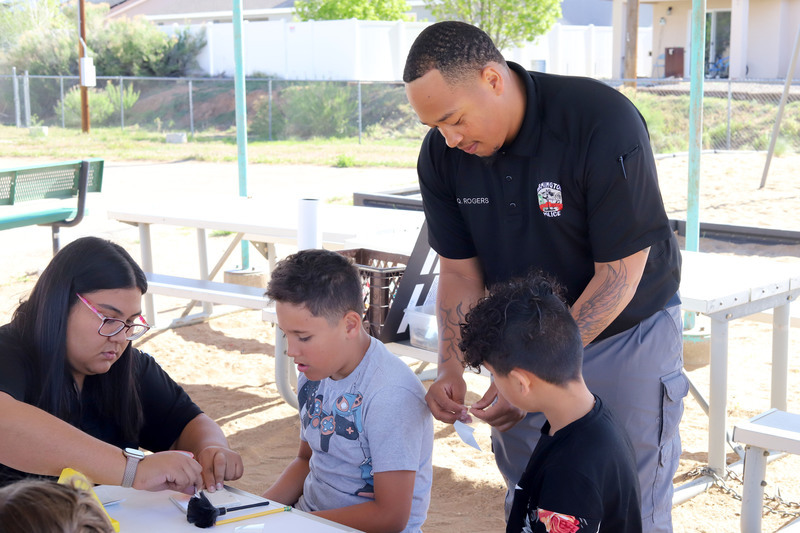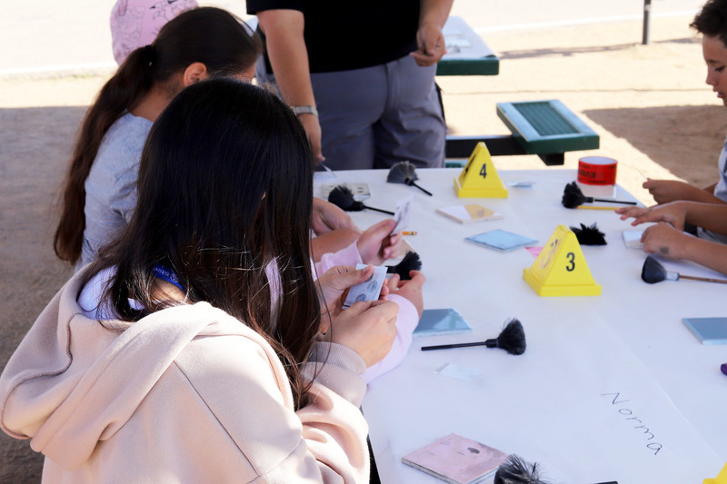 Crime Scene Investigators, Norma Ibarra, and Q Rogers explained the multifaceted career of a CSI. From writing skills to math and science, this career requires many competencies and a lot of tenacity. Students enjoying the light breeze outside asked what challenges CSIs face, to which Ibarra responded "Rain or shine, hot or cold, 2:00 p.m. or 2:00 a.m., we are on call to respond at all times." This job certainly takes dedication! Ibarra and Rogers then instructed students on how they take evidence, such as fingerprinting a scene. Students can practice these skills at home by using an old fluffy makeup brush, some baby powder, and tape to start lifting fingerprints!