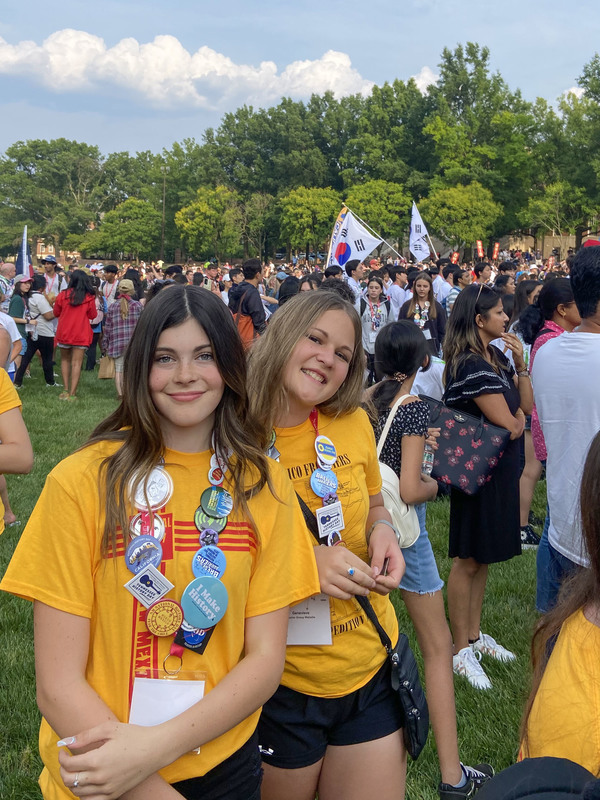 Evie Petersen and Grace McWilliams in the crowd at the NHD opening ceremony. The Korean international, Texas, and Ohio delegations are in the background with their flags.