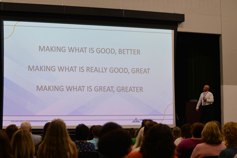 August 10, 2022: You are all good teachers, but are you open to seeking help when you need it? What are your core values? Are they empathy or respect? Is it problem-solving? Those were some of the questions Ben Springer of Totem PD asked during today’s Positive Behavioral Interventions and Supports (PBIS) training with two hundred FMS educators.