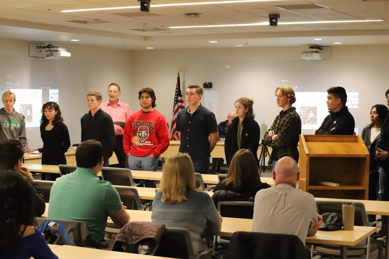 George Sharp, Investment Manager of Merrion Oil & Gas, recognized students David Cloer and Desirea Gurule of Bloomfield High School, Asher Harrison, Charles Briones, Jack Burns, Mariana Sawyer, and Rhys Triplett of Farmington High School, Anna Marie Keeler of Piedra Vista High School, and Caroline Teng, Ciara Mike, Jose Gutierrez, Krystal Lapahie, Kyra Smith, Logan Woods, Rainee Charley, and Seth Larribas of San Juan College High School.