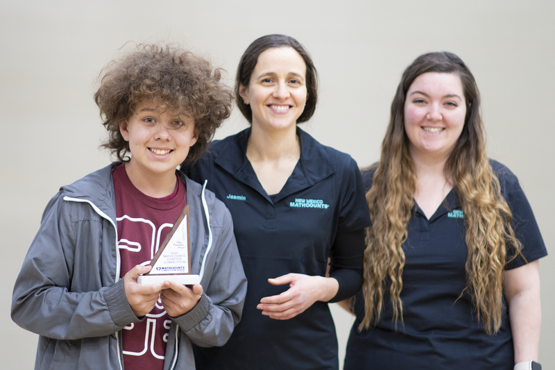 TMS student Logan Davis (left) won second place in the Target Round Competition. During the rounds, students had 60 seconds to solve a problem and press the buzzer with their answers. They were only allowed to use pencils and paper. In the photo, Logan receives his award from Albuquerque Chapter representatives.