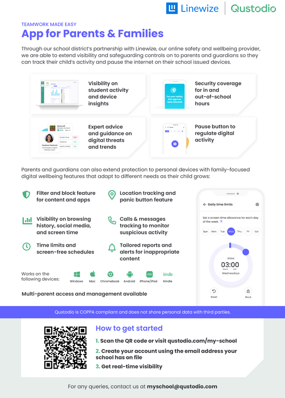Additionally, Sarah Sallmann, a former teacher and Linewize's lead onboarding consultant will demonstrate the Qustodio parent app and guide you through its setup process. This app can be a helpful tool for you to manage your children's online activities. More information is below.